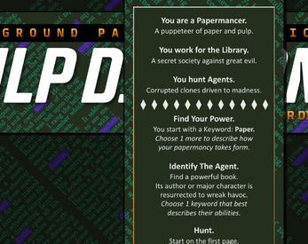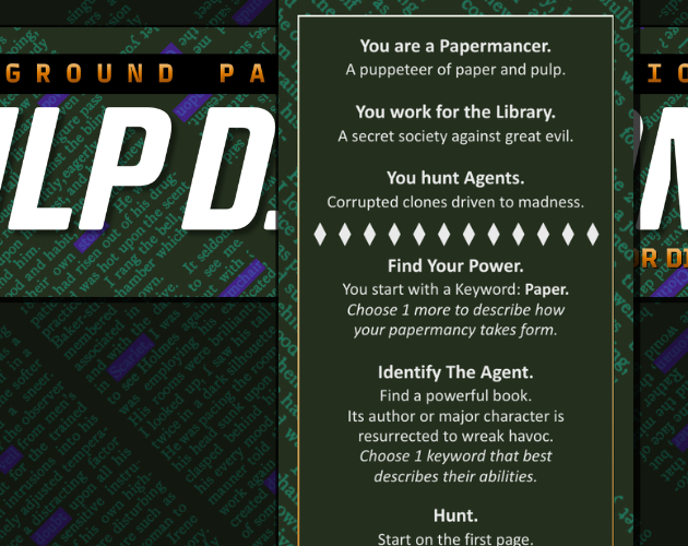 Pulp Diction is a bookmark role-playing game about playing secret paper mages. You are a Papermancer hunting Agents — evil clones driven mad in powerful literary works. Use your papermancy to protect the world, safeguard books and keep the peace.